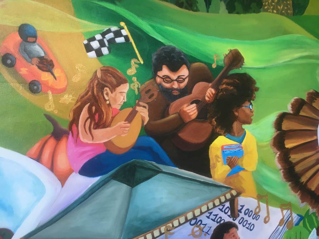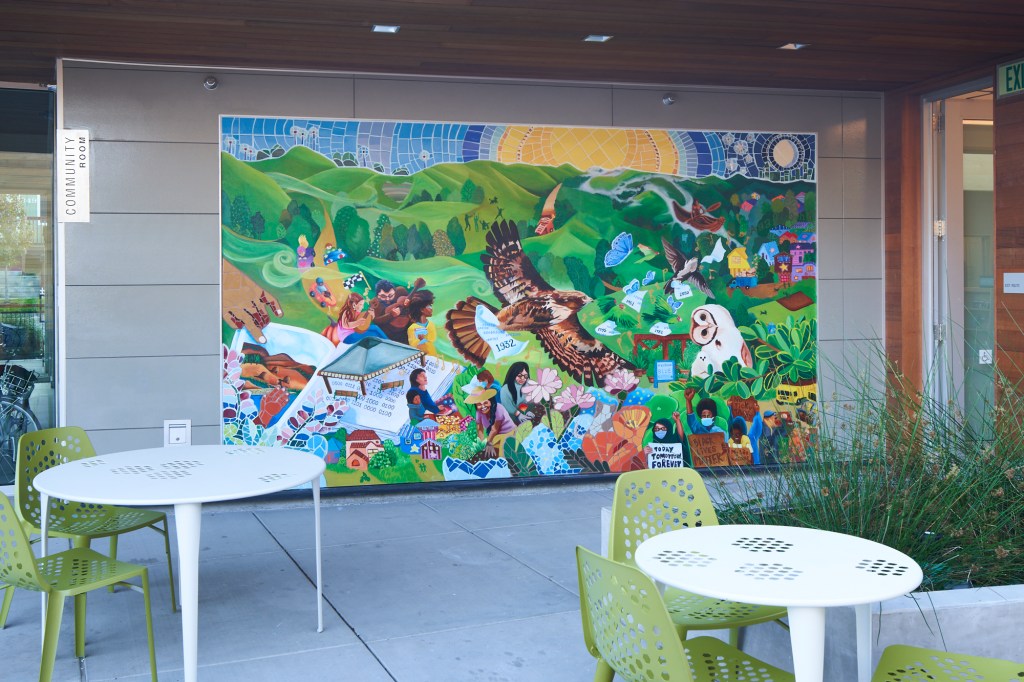 During the start of the Covid-19 closures we collaborated with the Friends of Brisbane Library and the neighboring Brisbane community over Zoom to host the first Precita Eyes community mural design workshop. The mosaic sections were cut by hand and laid on netting at the Precita Eyes Muralists studio, and later transported to Brisbane. The mural was installed during the construction of the new library by a team of all women artists.